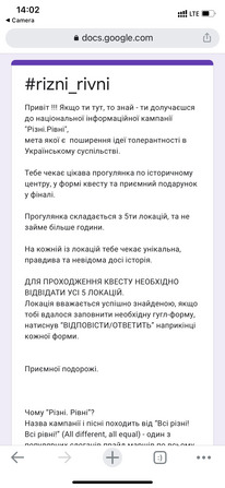 Відсканувавши на смартфоні QR-код ми потрапили на сторінку Google Forms, де коротко написали інформацію про себе та отримали фотопідказку наступної локації.