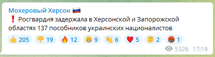 Російські пропагандистські телеграм-канали, створені з початком активної фази війни (“Главное в Херсоне”, “Мохеровый Херсон”, “Кирилл Стремоусов”, “Владимир Сальдо” та інші) постійно повідомляють про затримання українців, яких вони називають “посібниками українських націоналістів”.
