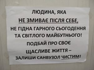 Звісно, за годину, яку ми провели в ДМСУ (нас було двоє), захочеться і до туалету. Кінець робочого дня, вже стомились. Як же у нас піднявся настрій, коли ми побачили ось ці чудові написи на дверях кабінок: