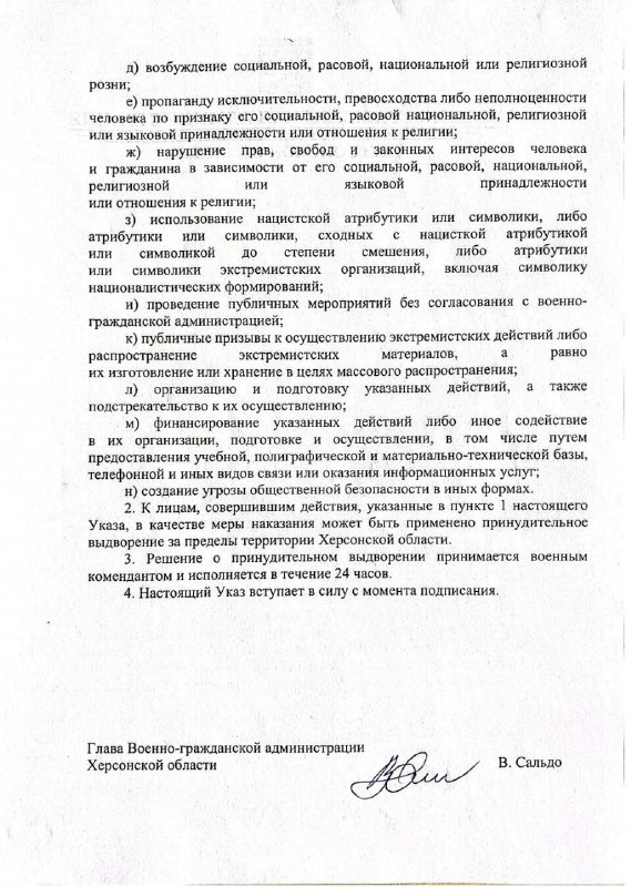 Озвучена російською окупаційною владою ініціатива винагороди за інформацію про український актив на Херсонщині отримала несподіване продовження. Владімір Сальдо видав указ про заборону критики, а слідом за ним видав наказ про примусову депортацію тих, хто не вписується в побудову “русского міра” на Херсонщині.