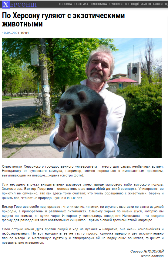 “UA-Суспільне:Херсон” знімало сюжети про Георгієва, про його “Театр зоолога” в приміщенні Херсонського державного університету. Пряма мова Георгієва, російською, була переозвучена українською, як того вимагає діюче законодавство. Можливо, звідти йдуть корені його шизофренічної істерії про “мєня заставлялі говоріть по-укрАінскі”? Мирний час, погодьтесь, якось інакше виглядає під час воєнного стану. Багато хто з присутніх та учасників цього репортажу навіть не здогадувались, що вже через рік дивакуватий Георгієв стане зрадником і колаборантом, який виступатиме під російським триколором.