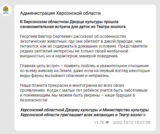 Дехто навпаки, на камеру стверджує, що залишається в Херсоні. Це керівник “Театру зоолога” Георгієв Віктор Сергійович. Людина, яка виглядає бомжувато та неохайно навіть у костюмі чи у смокінгу, не може говорити українською, отримала посаду керівника. “Мєня і дєтєй заставлялі говоріть на укрАінском язикє” — ось що розповідає Георгієв журналістам російського телебачення.