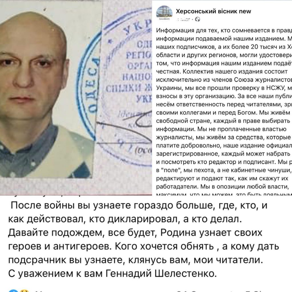 Оленою Некротковою та Геннадієм Шелестенком в Херсоні відкрито представництво окупантського “Союза Журналістов Россіі” (СЖР). Тож тепер їм не потрібні прострочені посвідчення НСЖУ чи саморобні посвідчення журналістів “Херсонський вісник new”, типу такого, яке вони видали свого часу депутату Херсонської міської ради Іллі Карамалікову на додачу до посвідчення НСЖУ.