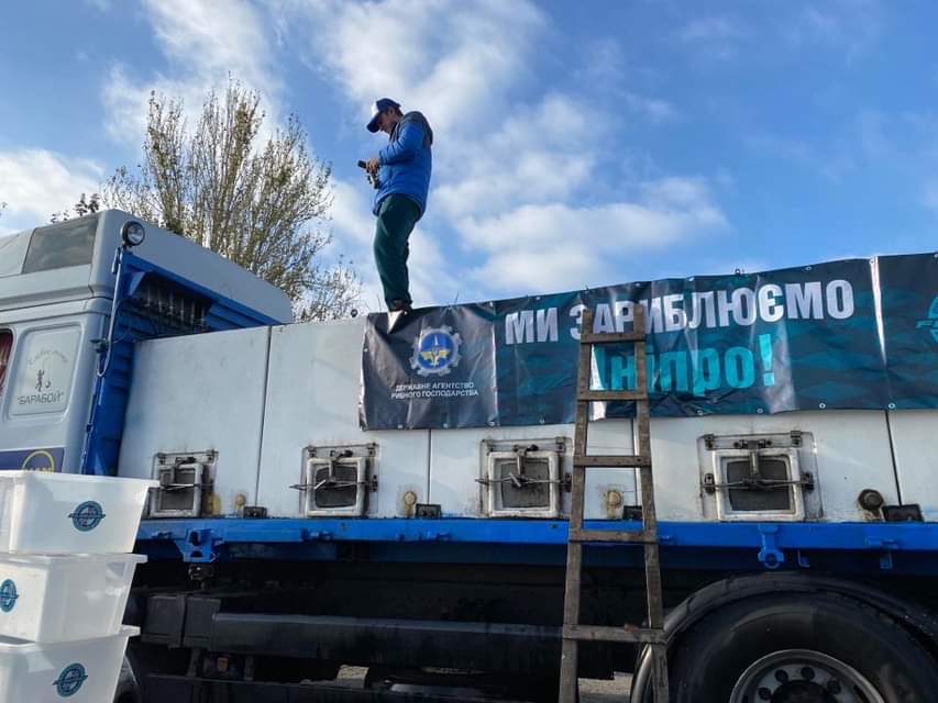 По-перше, хочеться подякувати торгівельній марці “Флагман” (якщо я правильно зрозумів, в Херсоні є магазин цієї мережі, де продається рибальське спорядження). Саме завдяки їх підтримці до Дніпра випустили мальків, яких спеціально виростили та привезли в ємностях.